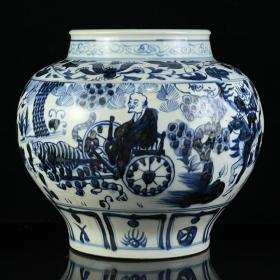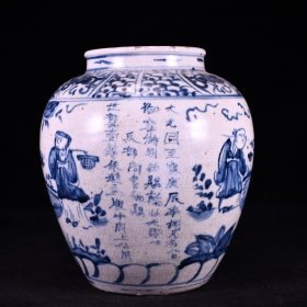 青花鬼谷子下山人物故事罐。高25*24。