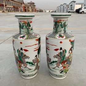 清代五彩棒槌瓶一对,人物故事纹饰,底部青花款识“大清乾隆年制”。 瓶身高约42厘米,肚径约17厘米,口径约13厘米。五彩釉色,画工精细,色彩鲜艳,人物生动,工艺精美。