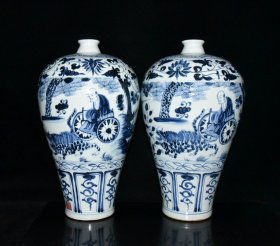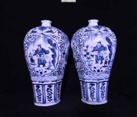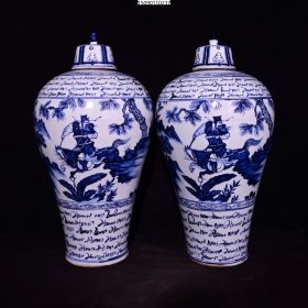 瓷器 元代波斯文青花鬼谷下山人物故事纹梅瓶一对【43×25cm】