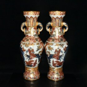 瓷器 元代成吉思汗青花釉里红描金萧何追韩信人物故事纹象耳瓶一对【59.8×22cm】