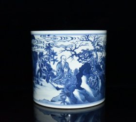 清代康熙青花讲经图人物故事笔筒【19.5x20.8cm】