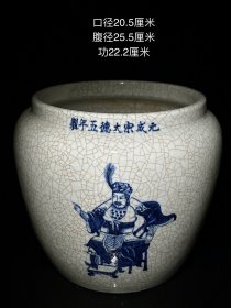 元成宗大德五年制,手绘青花蒙恬出征人物故事冰裂纹发财缸一只。