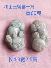 下乡所得和田玉雕刻玉貔貅一对卦件,沁色完美自然,包浆浓郁,玉质油润,皮壳老辣, 雕工精细,收藏佩戴佳品。