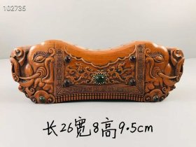 28_旧藏:黄杨木镶翡翠枕盒 规格:长26宽8高9.5cm 简介:黄杨木镶翡翠枕盒,纯手工雕刻,雕工精细,包浆自然,器型独特,品相完整