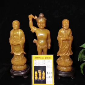 精雕,田黄石三世佛摆件,《高30cm》玉质油润细腻,包浆浓郁,保存完好无磕碰,雕工精细,沁色自然。成色如图。