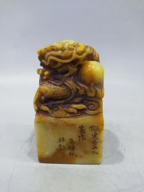 寿山石雕刻《龙戏珠》印章,包浆自然浑厚,石头通透,雕工精细,纯手工雕刻刻印 尺寸:11.3×6.1×6.1厘米 重量:957克