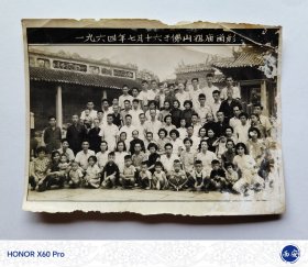 有许多穿着香云纱,1964年照相馆或摄影家拍摄《一九六四年七月十六于(广东)佛山祖庙留影群体合影照》原版黑白照片1张,照片左半边有折痕及请问腐蚀情况,具体品相如图