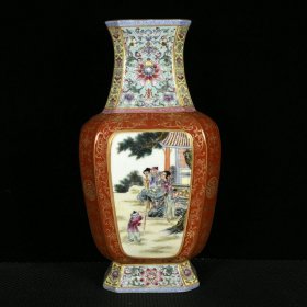 清雍正矾红描金开窗美人带子诗句纹瓶
