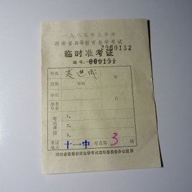 1985年上半年湖南省高等教育自学考试 临时准考证(考生:麦进成;考点:长沙十一中)