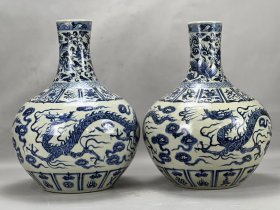 元青花双龙凤八宝缠枝花卉天球瓶一对