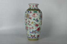 清乾隆-胭脂红轧道仙鹤花卉八宝纹瓜棱花口瓶