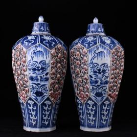 元青花釉里红鸳鸯戏莲八宝捏雕花卉纹八棱瓶规格49*25厘米