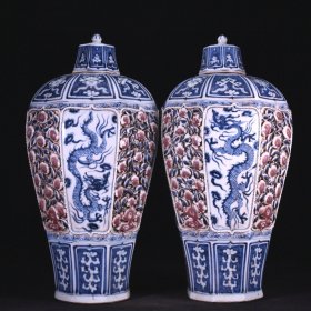 元青花釉里红开窗云龙捏雕花卉镂空八宝纹八棱梅瓶规格47*23厘米