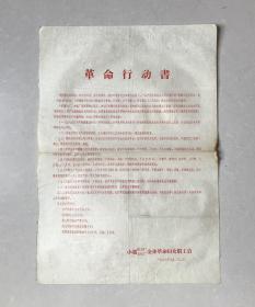 **传单,小越胶木厂、农机厂全体革命妇女职工启“革命行动书”,8开,1页。文中提到:不给小孩子及自己串耳环、不戴金戒(子)指、手镯、项圈.........