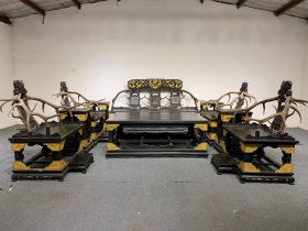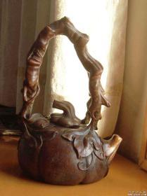 清代南瓜型竹根雕提梁壶(砚滴).整壶完全用天然竹根雕成,整体没有任何粘接。壶盖可开,并可装水。古香古色,极具艺术性。 非常罕见珍贵。 本器有北京拍卖行图录。 本器属高级博物馆首选藏品(暂定价30万元)
