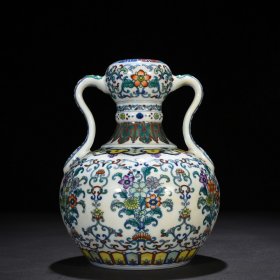 清雍正斗彩花卉纹如意耳蒜头瓶 24*18厘米