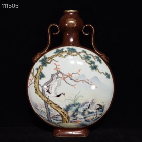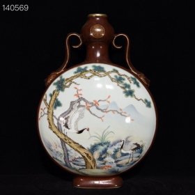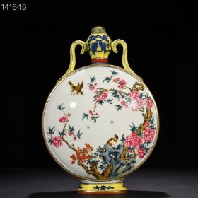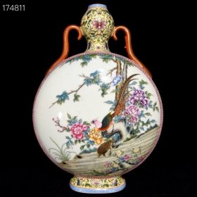 清乾隆木纹釉粉彩花鸟纹如意耳扁瓶,40×27×14,