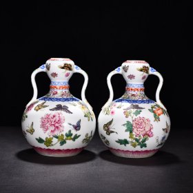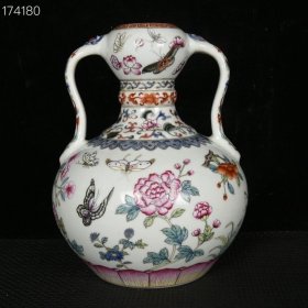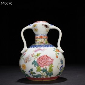 清雍正珐琅彩蝶恋花卉纹如意耳蒜头瓶 高23.5厘米 宽16.5厘米