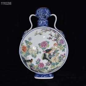 清乾隆青花八宝珐琅彩花鸟纹如意耳扁瓶 34*23厘米