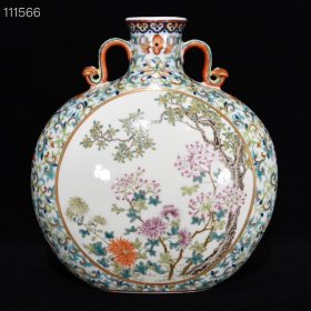 清乾隆粉彩花花鸟纹如意耳扁瓶,42×30×13