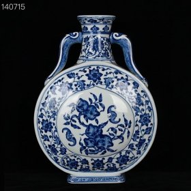 清乾隆青花缠枝花福寿桃纹如意耳扁瓶,