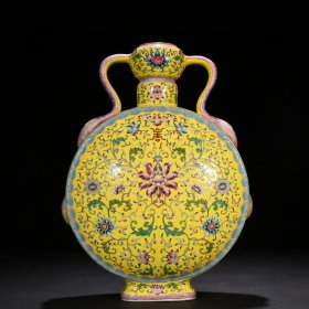 清雍正黄地粉彩福寿花卉纹如意耳扁瓶 40*30厘米