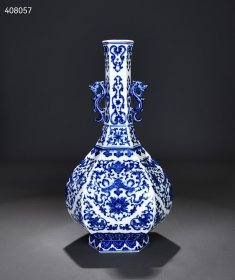 旧藏大清雍正青花缠枝福寿如意纹双耳六方瓶!