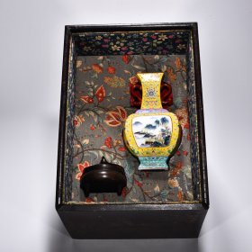 瓷器 清雍正黄地珐琅彩山水纹如意耳方瓶 盒高40厘米 宽28厘米 瓶高22厘米 宽11.8厘米