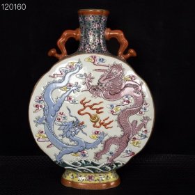 清乾隆珐琅彩描金雕刻二龙戏珠纹如意耳扁瓶,