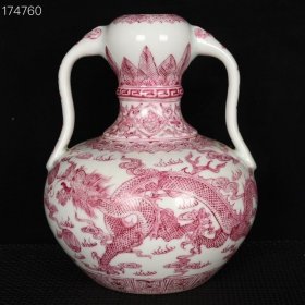 清乾隆玛瑙红彩云龙纹如意耳蒜头瓶 高23厘米 直径18厘米