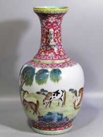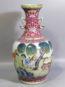 清道光 粉彩八骏图如意耳瓶