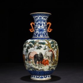 清乾隆青花粉彩八骏图如意耳瓶