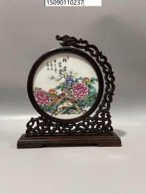 古董古玩旧藏老瓷器鸡翅木镶嵌瓷板画粉彩花鸟屏风30*32CM