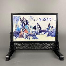 旧藏黑檀木精工手绘瓷板屏风 尺寸:长21cm宽11cm高36cm 重量:重1070g