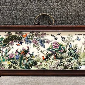 红木框镶嵌粉彩花鸟瓷板画《百鸟朝凤》横挂屏挂画屏风 品相如图 喜欢的朋友 尺寸:高20厘米 宽53厘米