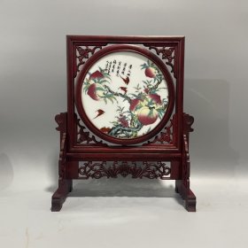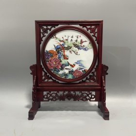 花梨木雕花框镶双面瓷板画摆件座屏屏风!《深谷幽隐》和《鸟语花香》尺寸高35宽30