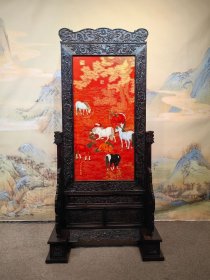 王步作品红木彩绘镶瓷板画青花动物形影不离吉祥如意屏风
