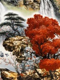 汪野亭作品红木雕龙纹镶瓷板画粉彩山水金秋神韵屏风