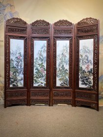 刘雨笒作品红木透雕镶瓷板画粉彩花鸟梅兰竹菊四折落地屏风