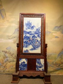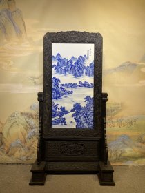 王步作品红木镶瓷板画青花山水源远流长天圆地方隔断屏风