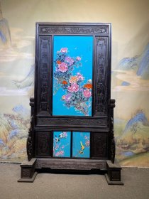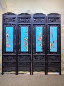 刘雨笒作品红木镶瓷板画松石釉粉彩花鸟四折落地屏风