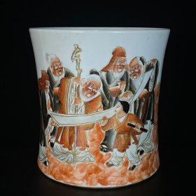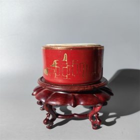 清咸丰矾红墨彩描金翁赏图纹笔筒 21x22厘米
