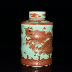 豆青釉矾红描金龙纹竹节盖罐【15.5x10cm】