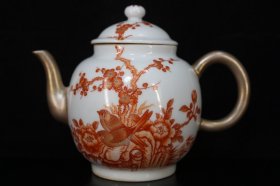 雍正矾红描金花鸟纹壶 宽16.8厘米高13.5厘米