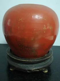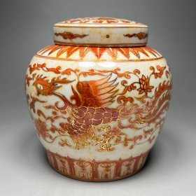 明代矾红描金凤穿牡丹纹盖罐 高14厘米宽13.5厘米