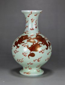 乾隆年制 豆青釉描金加矾红彩狮子滚绣球赏瓶 高15厘米 直径10厘米