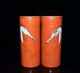 民国矾红描金松鹤延年帽筒一对【 28.5x12.2cm 】