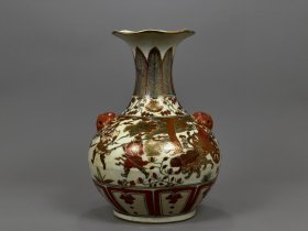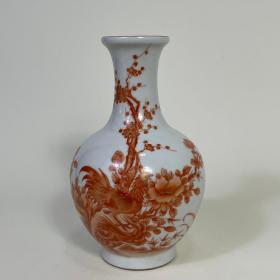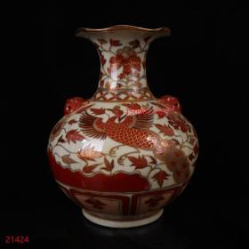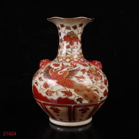 古董古玩老瓷器收藏 元代矾红描金凤纹花口瓶23*32CM
