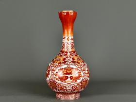 清乾隆矾红描金花卉纹蒜头瓶 古玩古董古瓷器老货收藏