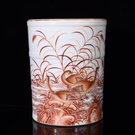 清乾隆矾红描金卢雁纹笔筒。